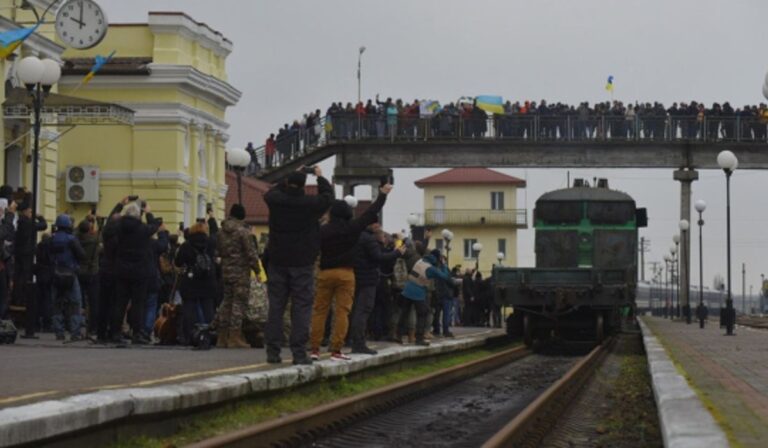 A herszoni pályaudvaron ünneplő tömeg fogadta a különvonatot.