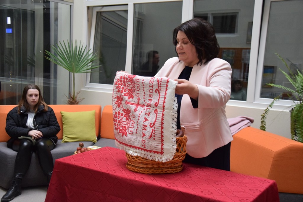 A Filológia Campus aulájában Kész Margit, a Magyar Tanszéki Csoport docense köszöntötte a jelenlévőket. Kiemelte, a taszék munkatársai arra törekedtek, hogy az érdeklődőket bevezessék a hagyományos húsvéti szokásokba. Ezt követően bemutatta a szentelményi kosarat azokkal az ételekkel, melyeket megszentelésre vittek. Ezek közül is a legfontosabb a báránykára formázott vaj, a hímes tojás, a cékla, a torma, a bor, a sonka és a kolbász, valamint a pászka, melyet kendővel, ún. pászkaterítővel takartak le.
