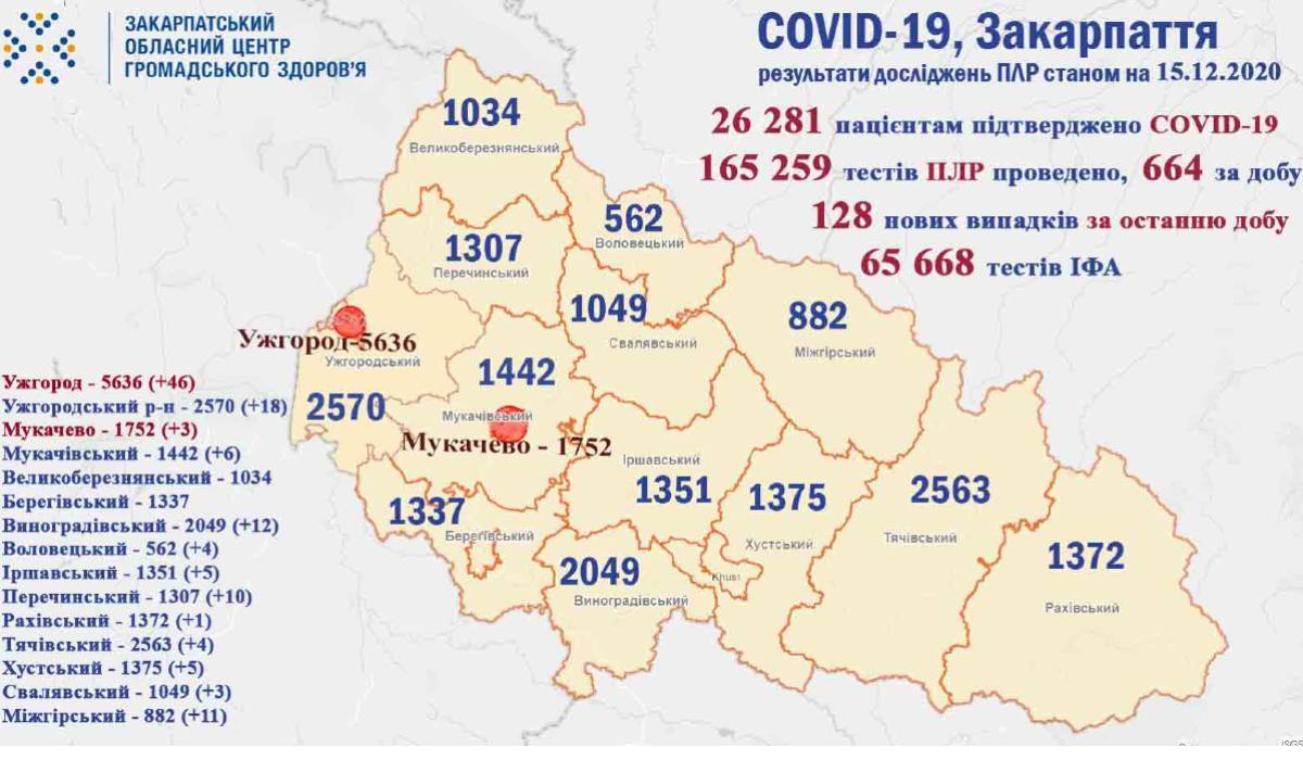 A Kárpátaljai Megyei Közegészségügyi Központ december 15-i adatai szerint 128 koronavírussal fertőzött beteget regisztráltak az elmúlt 24 órában – tudatta a központ a közösségi oldalán.