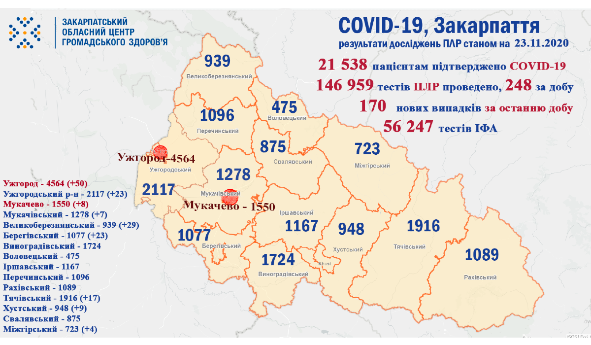 A Kárpátaljai Megyei Közegészségügyi Központ november 23-ai adatai alapján 170 új koronavírussal fertőzött beteget regisztráltak az elmúlt 24 órában, közülük 7 egészségügyi dolgozó és 15 gyerek – olvasható a központ közösségi oldalán.