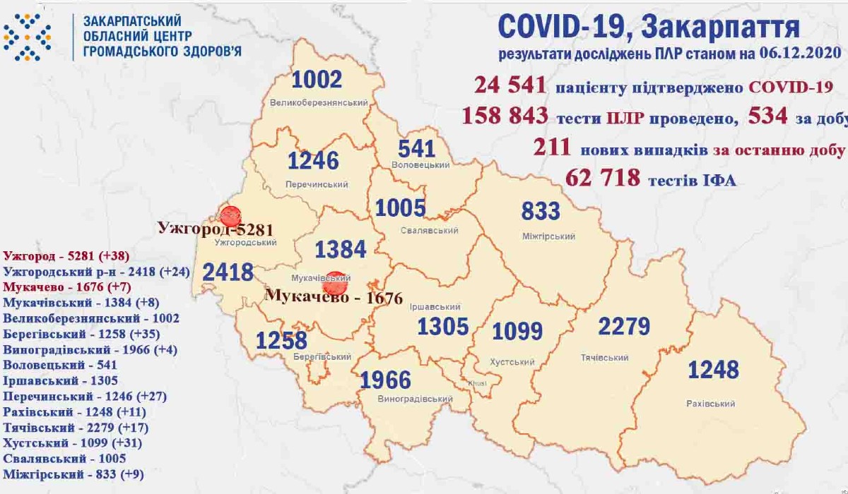 A Kárpátaljai Megyei Közegészségügyi Központ december 6-ai adatai szerint 211 koronavírussal fertőzött beteget regisztráltak az elmúlt 24 órában, közülük 8 egészségügyi dolgozó és 12 gyerek – tudatta a központ a közösségi oldalán.