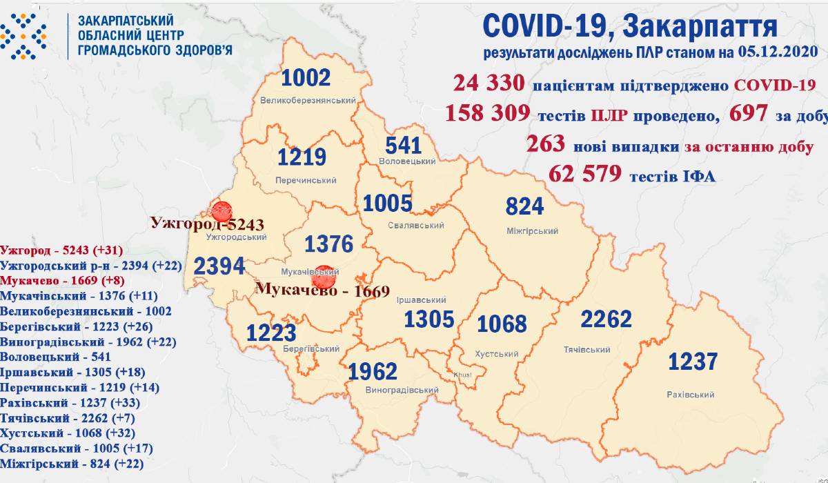 A legtöbb fertőzöttet, 33-at a Rahói járásban észlelték, ezt követi a Huszti járás 32 fertőzöttel. A megyeszékhelyen 31 új koronavírusost találtak. A Beregszászi járásban 26-tal nőtt a vírusosok száma. A Nagyszőlősi, az Ökörmezői és az Ungvári járásokban egyformán 22-22-en fertőződtek meg. Az Ilosvai járásban 18-cal, a Szolyvai járásban 17-tel, a Perecsenyi járásban 14-gyel, a Munkácsi járásban 11-gyel (Munkácson 8-cal), a Técsői járásban 7-tel emelkedett a betegek aránya.