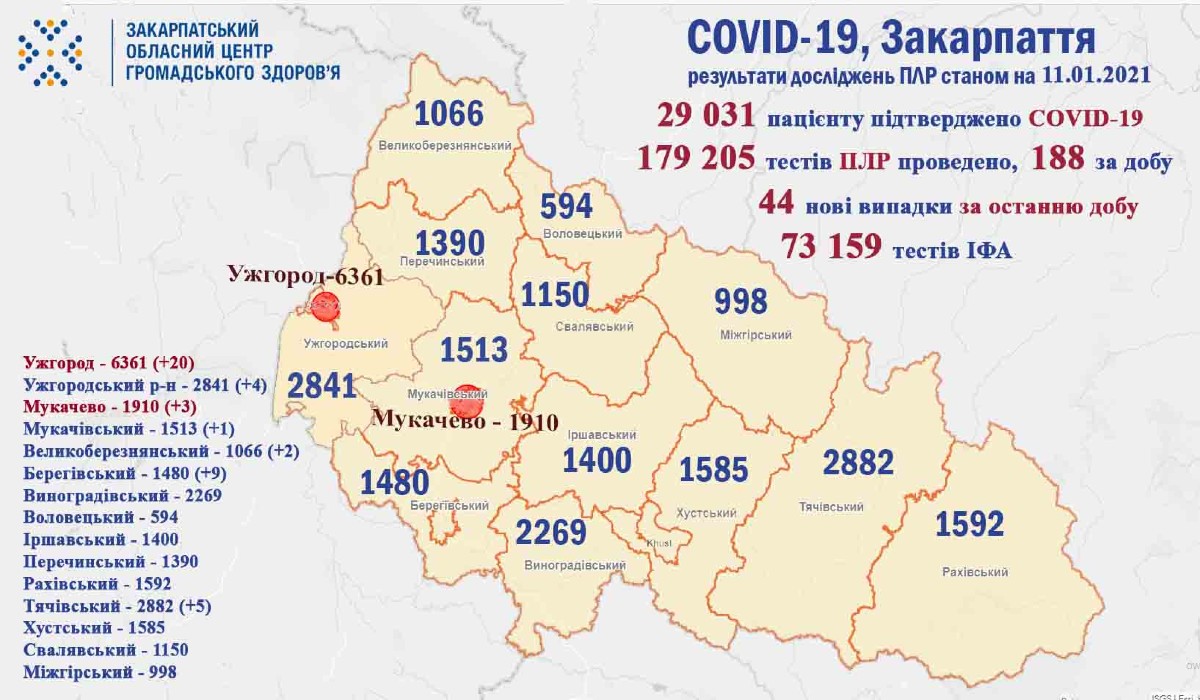 Az elmúlt 24 órában a megyében 44 koronavírusost diagnosztizáltak, köztük 2 egészségügyi dolgozót – derül ki a Kárpátaljai Közegészségügyi Központ adataiból.