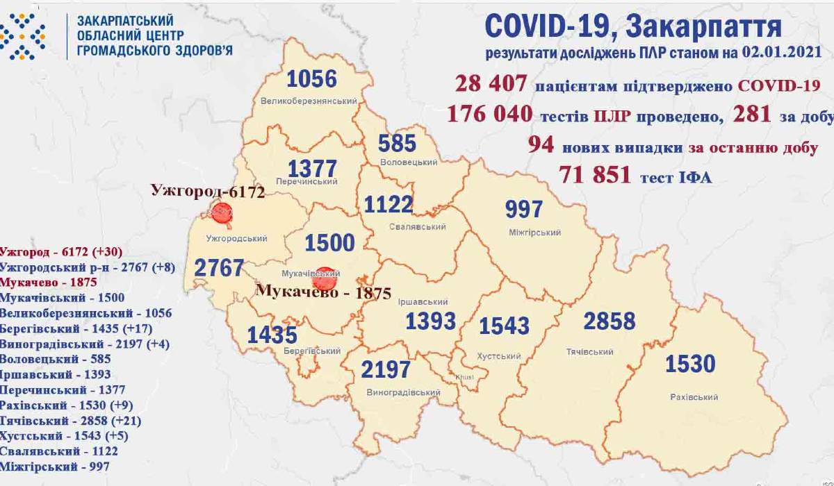 A megyeszékhelyen 30 fertőzöttet regisztráltak. Járási szinten a legtöbb koronavírusost, 21-et a Técsői járásban találtak. Ezt követi 17-tel a Beregszászi járás, 9-cel a Rahói járás, 8-cal az Ungvári járás, 5-tel a Huszti járás és 4-gyel a Nagyszőlősi járás.