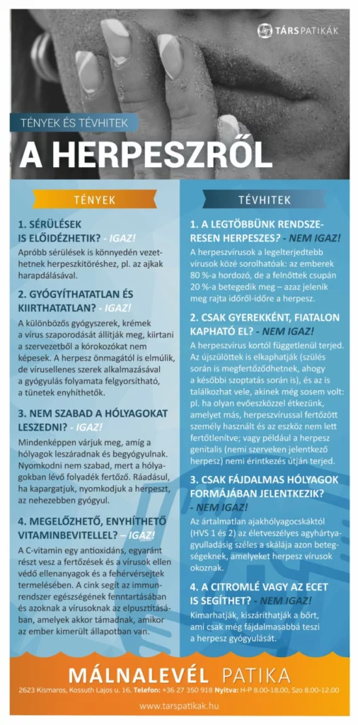 Az emberek többsége már gyermekkorában találkozik a herpeszvírussal, és felnőttkorára már a lakosság nagy része fertőzött, miközben az érintettek négyötöde nem is tapasztal tüneteket – emelte mi Facebook-posztjában a kismarosi Málnalevél Patika. Bejegyzésükhöz az alábbi infografikát mellékelték, amelyen 4 tényt és 4 tévhitet ismertetnek a herpeszről.