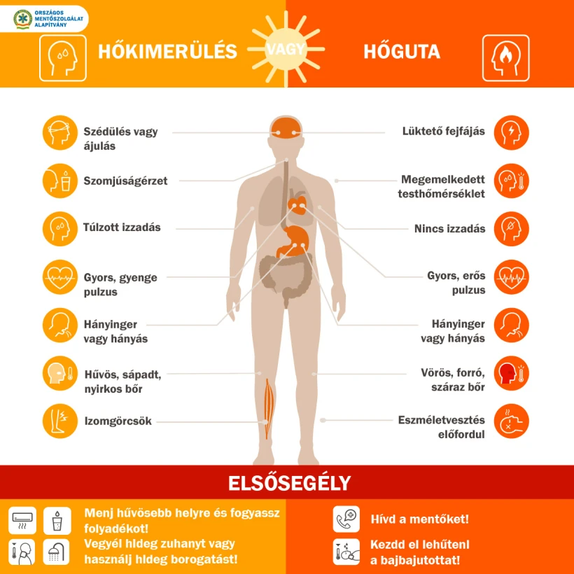 Az alapítvány által megosztott infografika szerint hőkimerülésre szomjúságérzet, túlzott izzadás, hűvös, sápadt és nyirkos bőr, hányinger vagy hányás, gyors és gyenge pulzus, izomgörcs, valamint szédülés vagy ájulás hívhatja fel a figyelmet. Ebben az esetben a legfontosabb, hogy az érintett hűvösebb, légkondicionált helyiségbe húzódjon, igyon, valamint próbálja lehűteni magát borogatással vagy langyos zuhannyal.