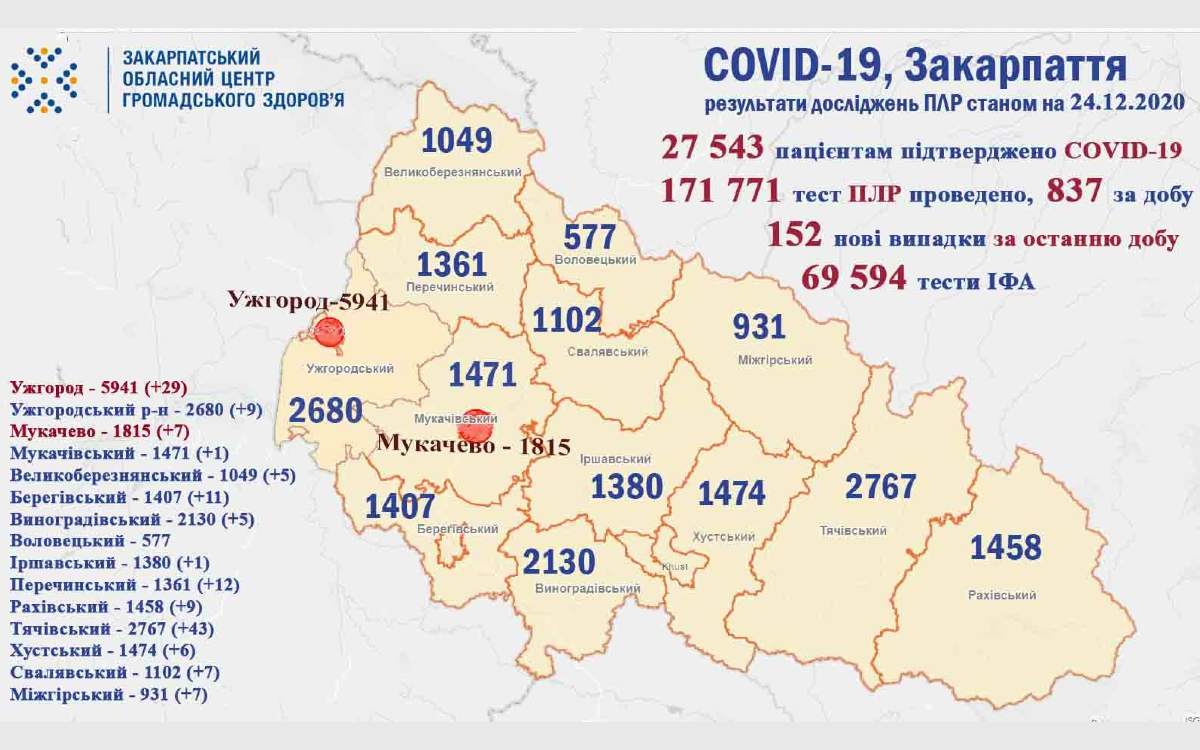A pandémia kezdetétől összesen 27 543 esetben diagnosztizálták a betegséget Kárpátalján. A halálos áldozatok száma 619.