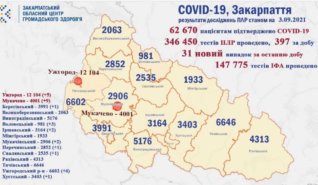 Ungváron 5, Munkácson 9 fertőzöttet jegyeztek fel. Járások terén az Ungvári járásban volt a legtöbb, 6 fertőzött, ezt követi a Volóci járás 3-mal. Az Ilosvai és a Munkácsi járásokban 2-2, a Beregszászi, a Huszti, a Perecsenyi és a Szolvyai járásokban pedig mindenütt 1-1 újabb esetet regisztráltak.
