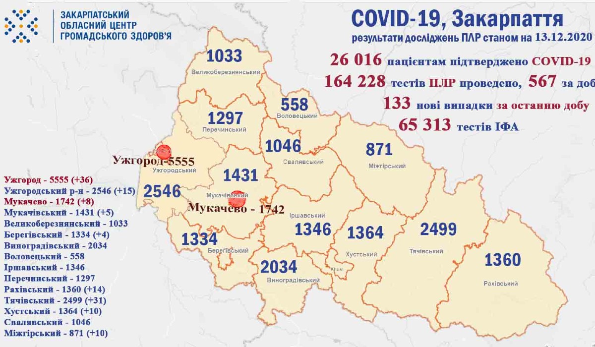 A Kárpátaljai Megyei Közegészségügyi Központ december 13-ai adatai alapján 133 új koronavírussal fertőzött beteget regisztráltak az elmúlt 24 órában megyénkben, közülük 3 egészségügyi dolgozó és 5 gyerek – olvasható a központ közösségi oldalán.