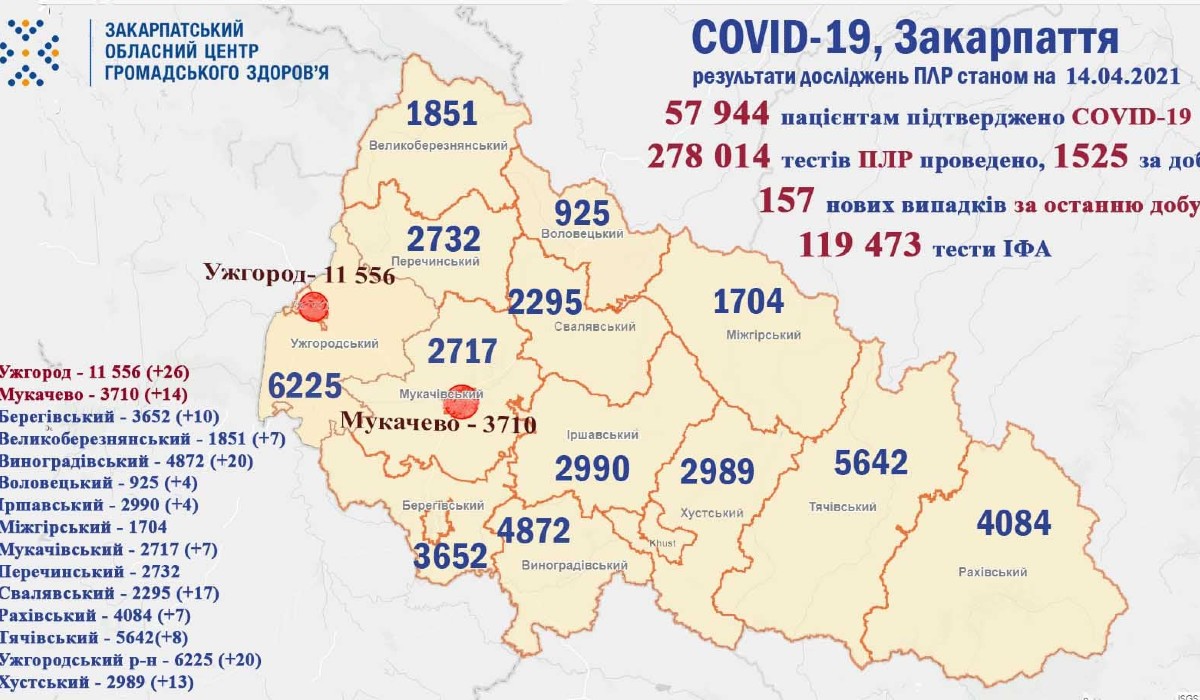 A pandémia kezdetétől összesen 57 944 esetben diagnosztizálták a betegséget Kárpátalján. A halálos áldozatok száma 1 451.