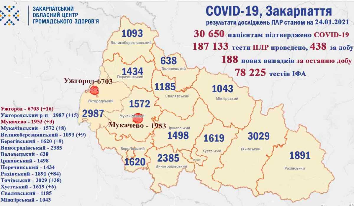 Járási szinten legtöbb fertőzöttet a Rahói járásban diagnosztizálták, 84 embert, a legkevesebbet a Huszti járásba, 6-ot. 38 fertőzöttet találtak a Técsői járásban, 15-öt az Ungvári járásban, 9-9-et a Beregszászi és a Nagybereznai járásban, 8-at a Munkácsi járásban.