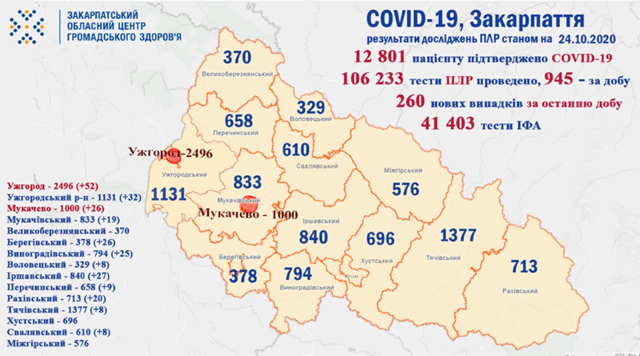 A Kárpátaljai Megyei Közegészségügyi Központ október 24-ei adatai alapján 260 új koronavírussal fertőzött beteget regisztráltak az elmúlt 24 órában megyénkben – olvasható a központ közösségi oldalán.