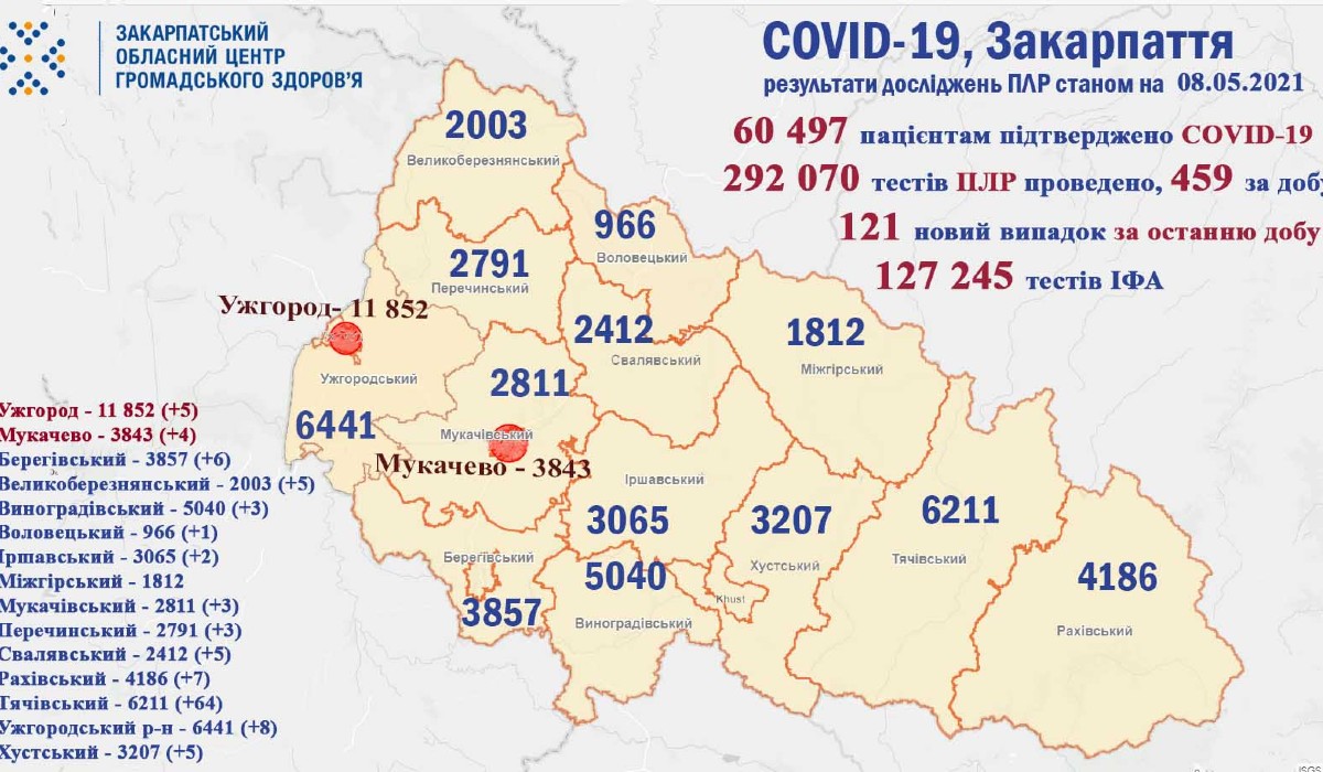 A pandémia kezdetétől összesen 60 497 esetben diagnosztizálták a betegséget Kárpátalján. 55 979-en gyógyultak fel a vírusból.