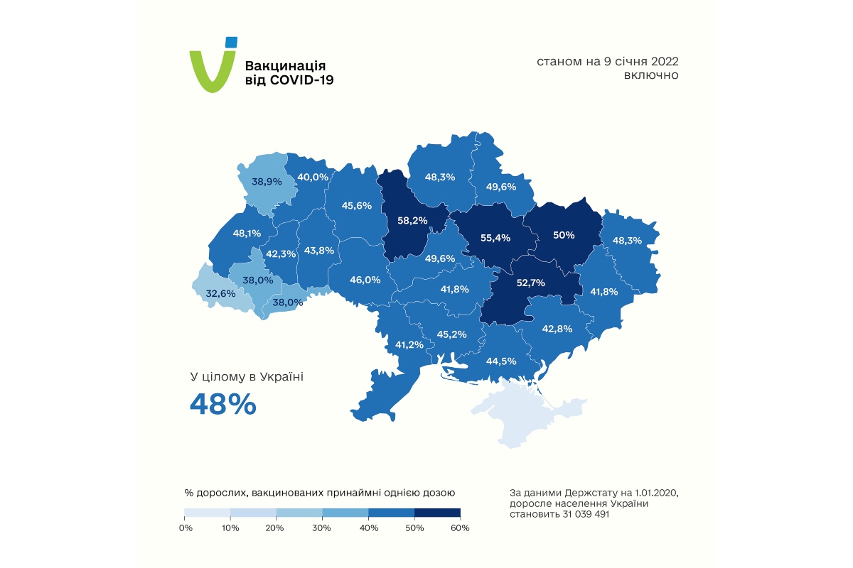 Kárpátalján a legalacsonyabb az átoltottság Ukrajna Egészségügyi Minisztériumának január 9-i adatai szerint. Az országban a felnőtt lakosság 48%-a kapta meg a koronavírus-oltásokat.