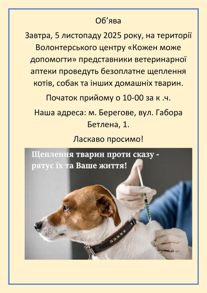 Az oltópont a Mindenki Segíthet (Kozsen Mozse Dopomohti) Önkéntes Központ területén (Beregszsáz, Bethlen Gábor utca 1.) várja a gazdákat és házi kedvenceiket kijevi idő szerint 10.00 órától.