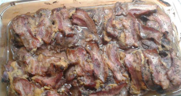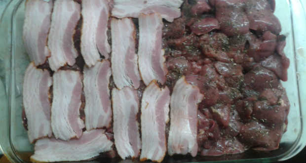 - A bacont felszeleteljük és megkenjük azokat a mustáros keverékkel. Ha hosszúak a bacon szeletek, akkor a májat egyesével körbetekerjük baconnel. Ha nem állnak rendelkezésünkre olyan nagy bacon szeletek, akkor lapos tűzálló tálba helyezünk alulra egy sor bacont, rátesszük a májat, majd felül is baconnel fedjük.