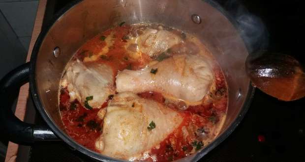 - Visszatesszük a tűzhelyre, majd beletesszük a csirkecombokat.
