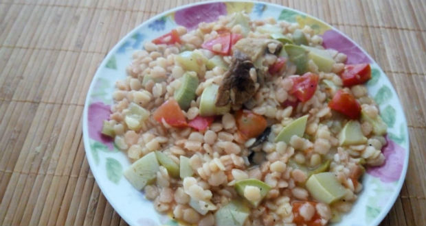 - Ha a hagyma üveges lesz, felöntjük egy liter vízzel. A gombát megmossuk, meleg vízbe áztatjuk néhány percre, majd hozzáadjuk a tarhonyához. A zöldségeket megmossuk, megtisztítjuk, felkockázzuk. Elsőként a paprikát adjuk hozzá a készülő ételhez, majd mehet a paradicsom és a cukkini.