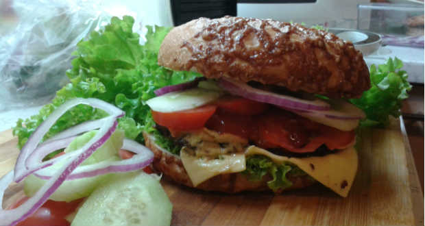 • A húskorongokat pár csepp olajban megsütjük, belehelyezzük a zsömlékbe, hozzáteszünk egy szelet sajtot, majd ízlés szerint paradicsommal, uborkával, hagymával és salátával gazdagítjuk.