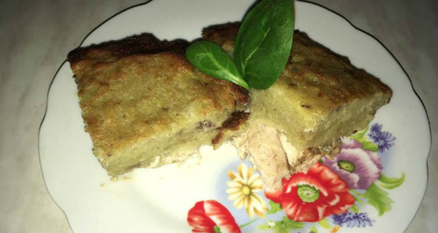 • Étolajjal kikenjük a jénai tálat. Alulra a hússzeleteket helyezzük és ráöntjük az előkészített masszát. 1-2 ek étolajat csurgatunk a tetejére, illetve 1-2 ek vizet.