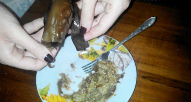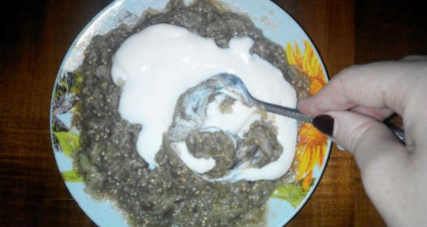 - A padlizsánok belsejét villával összetörjük, s ízlés szerint sóval, borssal, zúzott fokhagymával ízesítjük.