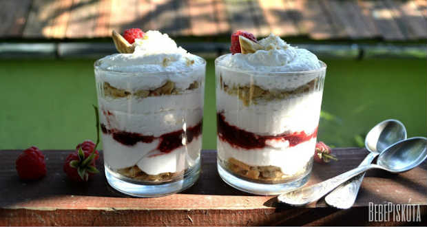 • Összerakjuk a pohárkrémet: a poharak aljára tegyünk kekszet, majd rétegezzük rá a túrókrémet. Én habzsákból nyomtam, de egész nyugodtan lehet kanalazni is. Ezután jön egy gyümölcsös réteg, majd ismét túrókrém. Ismét egy kekszréteg jön, majd a túrókrémmel zárjuk a sorozatot.