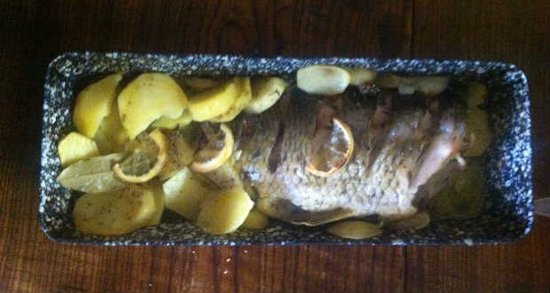 - Köré tesszük a hosszúra vágott burgonyát, a hagymakarikákat, és megszórjuk majoránnával és kakukkfűvel.