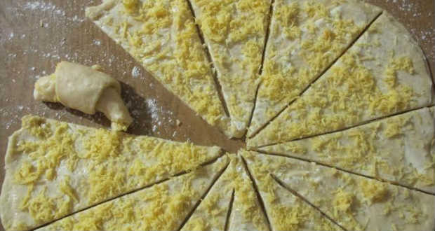 - Az egyik kinyújtott lapot megkenjük vajjal és megszórjuk a reszelt sajt negyedrészével.