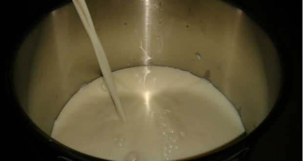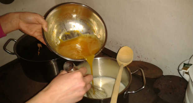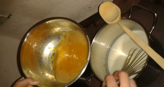 - Amikor a tej meleg (nem forró), lassan beleöntjük a tojásokat, közben keverjük a tejet.