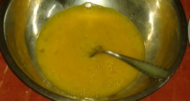 - Egy mélyebb tányérban felverjük a tojásokat és ételízesítővel fűszerezzük.