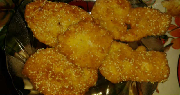 - A hússzeleteket beleforgatjuk a lisztbe, utána a tojásba, és végül a szezámmagos panírmorzsába.