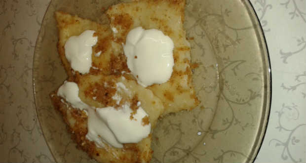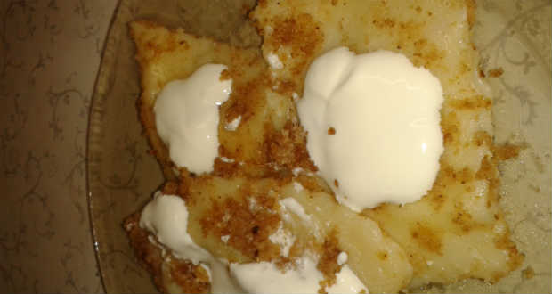 - A derelyét forrásban lévő sós vízben kifőzzük, leöblítjük, és a pirított zsemlemorzsába forgatjuk. Tejföllel tálaljuk.