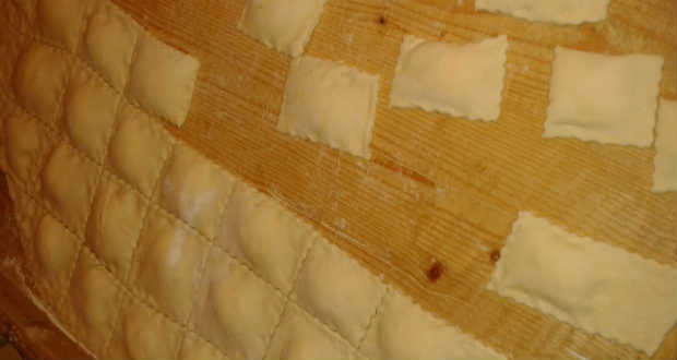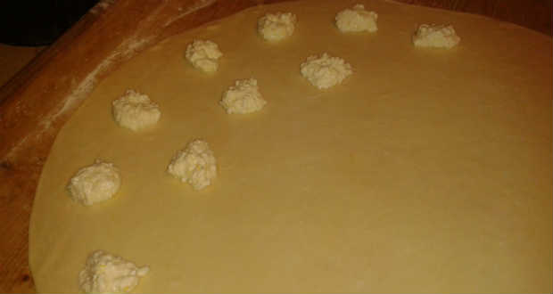 - A tésztát kinyújtjuk, majd az egyik felére körülbelül 5 cm-es távolságra teszünk 1-1 kiskanál tölteléket. A másik felét ráhajtjuk, a túró közötti részeket jól lenyomkodjuk, és derelyemetszővel kivágjuk.
