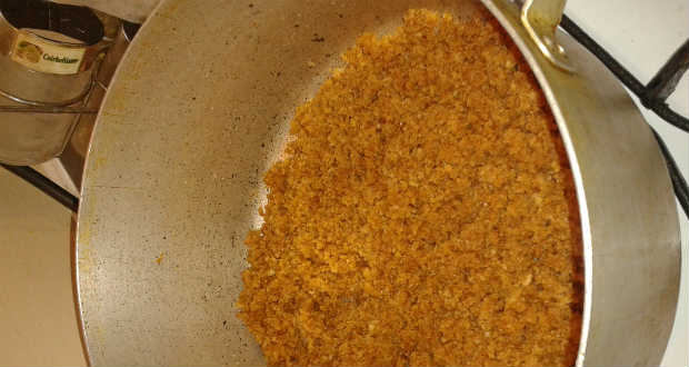 - A zsemlemorzsát olajon barnára pirítjuk, megcukrozzuk és fahéjat szórunk rá.