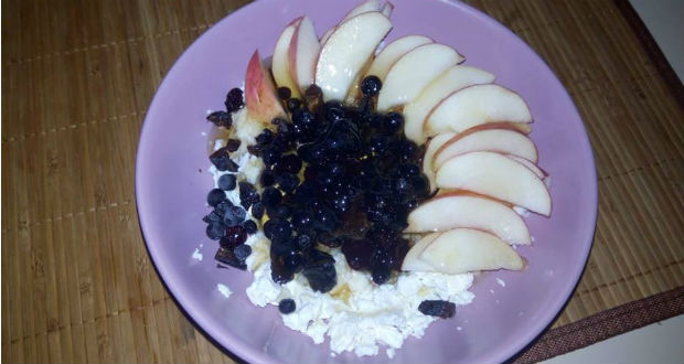 - A túrót két részre osztjuk, mély tálkákba rakjuk, villával jól összetörjük. Rétegenként hozzáadjuk az áfonyát, az aszalt meggyet, a felaprított aszalt szilvát, a felcikkezett almát. Tetejére mézet csurgatunk és fogyaszthatjuk is.