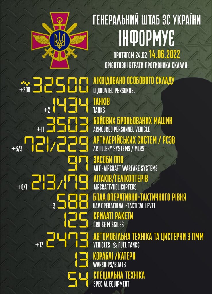 Több mint 32 ezer orosz katona halt meg a háborúban az Ukrán Fegyveres Erők vezérkarának június 14-én közzétett hadijelentése szerint.