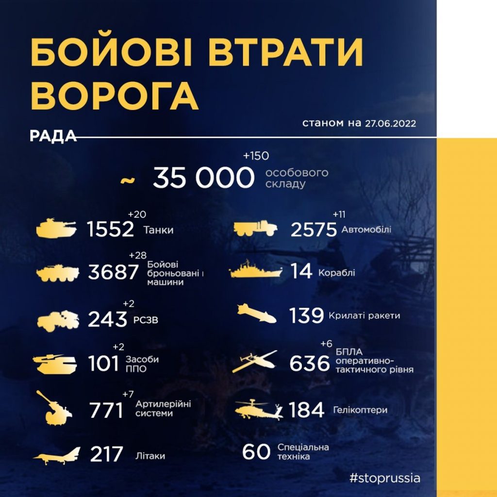 Eddig összesen 35 000 orosz katona halt meg a háborúban az Ukrán Fegyveres Erők vezérkarának június 27-én közzétett hadijelentése szerint.