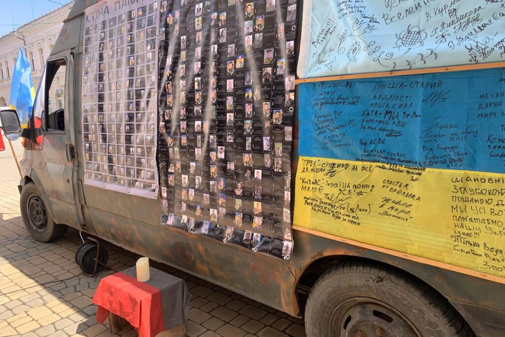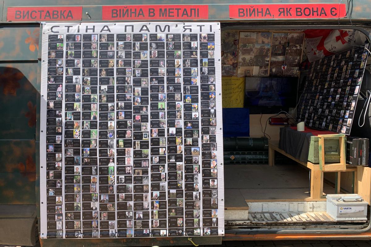 A tárlat egy kisbuszban kapott helyet, amelynek falain az elhunyt katonák képei, adatai, valamint több aláírt zászló látható.