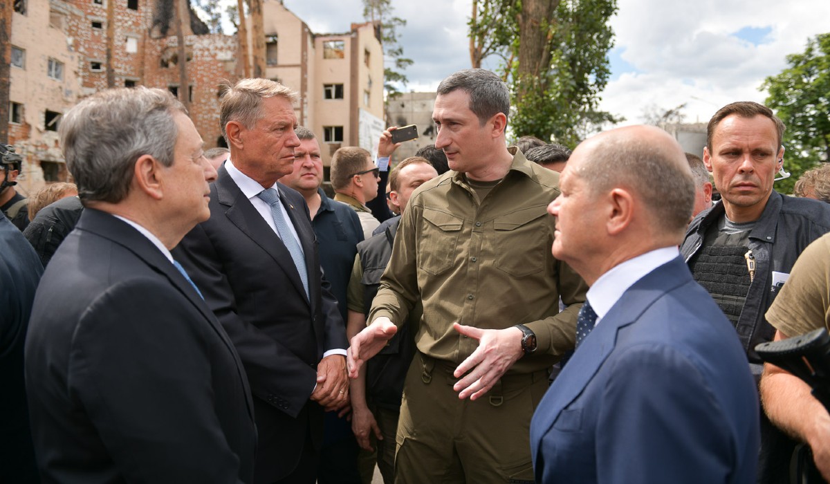 Emmanuel Macron francia elnök, Olaf Scholz német kancellár és Mario Draghi olasz kormányfő csütörtökön Kijevbe érkezésük után felkeresték az ukrán főváros Irpiny negyedét, ahol Klaus Iohannis román elnök is csatlakozott hozzájuk.