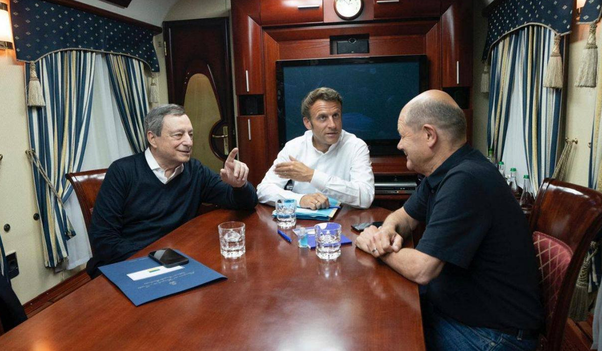 A három vezető Lengyelországban szállt különvonatra. Macron, Scholz és Draghi „éjszakai találkozót” tartott a délkelet-lengyelországi Rzeszówban, ahol nemzetközi repülőtér található, mielőtt tovább utaztak Kijevbe – jelentette a ZDF német köztelevízió.
