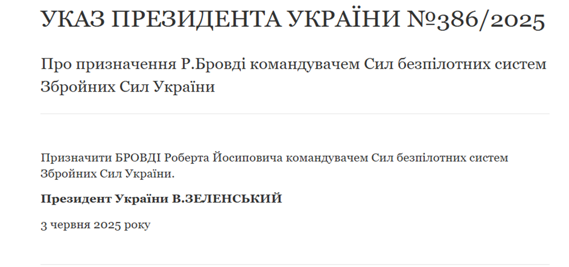 Volodimir Zelenszkij elnök a kárpátaljai Robert Brovdit nevezte ki az Ukrán Fegyveres Erők pilóta nélküli rendszerekért felelős parancsnokává. A vonatkozó rendeletet június 3-án tették közzé az Elnöki Hivatal oldalán.