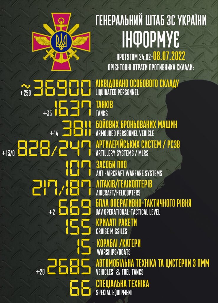 Eddig összesen 36 900 orosz katona halt meg a háborúban az Ukrán Fegyveres Erők vezérkarának július 8-án közzétett hadijelentése szerint.