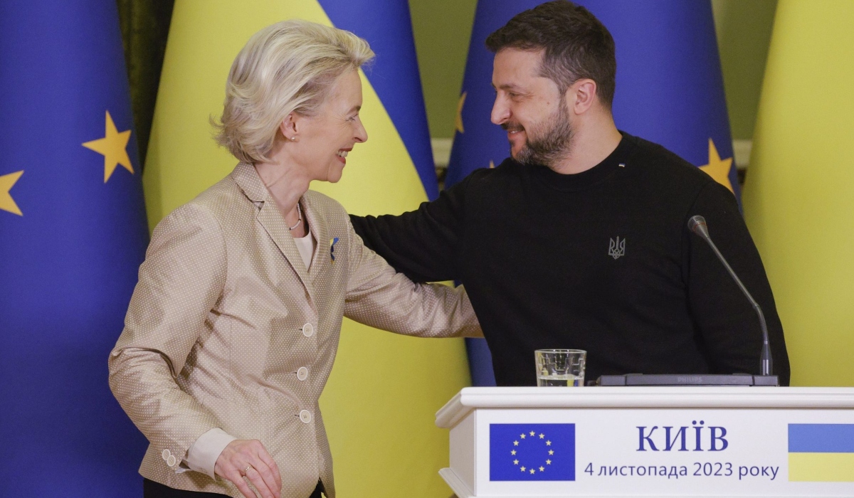 (Nyitókép: Ursula von der Leyen, az Európai Bizottság elnöke és Volodimir Zelenszkij ukrán elnök a kijevi megbeszéléseit követő sajtóértekezleten 2023. november 4-én. (Fotó: MTI/EPA/Szerhij Dolzsenko)