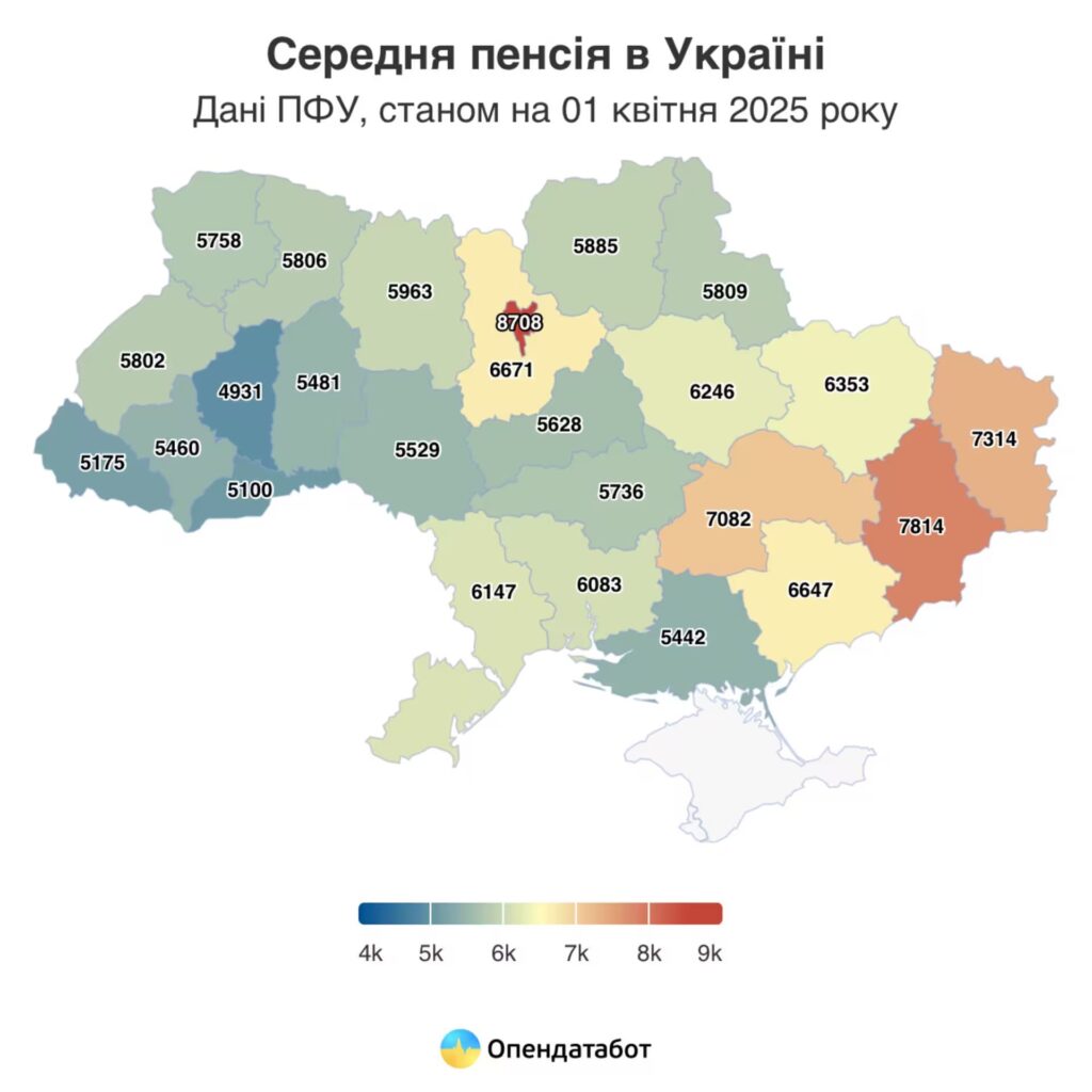 A legmagasabb átlagnyugdíjat Kijevben folyósítják (8 708 hrivnya), ezt követi a Donyecki (7 814 hrivnya) és a Luhanszki terület (7 314 hrivnya). A legalacsonyabb nyugdíjakat Ternopil (4 931 hrivnya), Csernyivci (5 100 hrivnya) és Kárpátalja (5 175 hrivnya) megyékben fizetik.