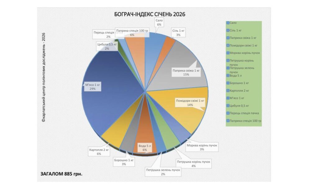 Az eredmények alapján 2025 utolsó hónapjához képest 6,4%-kal, vagyis 54 hrivnyával ugrottak meg az árak Kárpátalján. A mérés szerint egy ötfős család 2026 januárjában 885 hrivnyát költene egy egyszeri bográcsozásra.
