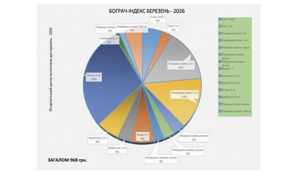 Elkészült a Kárpátaljai Közvélemény-kutató Központ márciusi kimutatása, amely szerint ismét jelentősen drágult az élelmiszer Kárpátalján. A március 12-én közzétett statisztika szerint egy ötfős család számára közel ezer hrivnyába kerül elkészíteni a bográcsgulyást.
