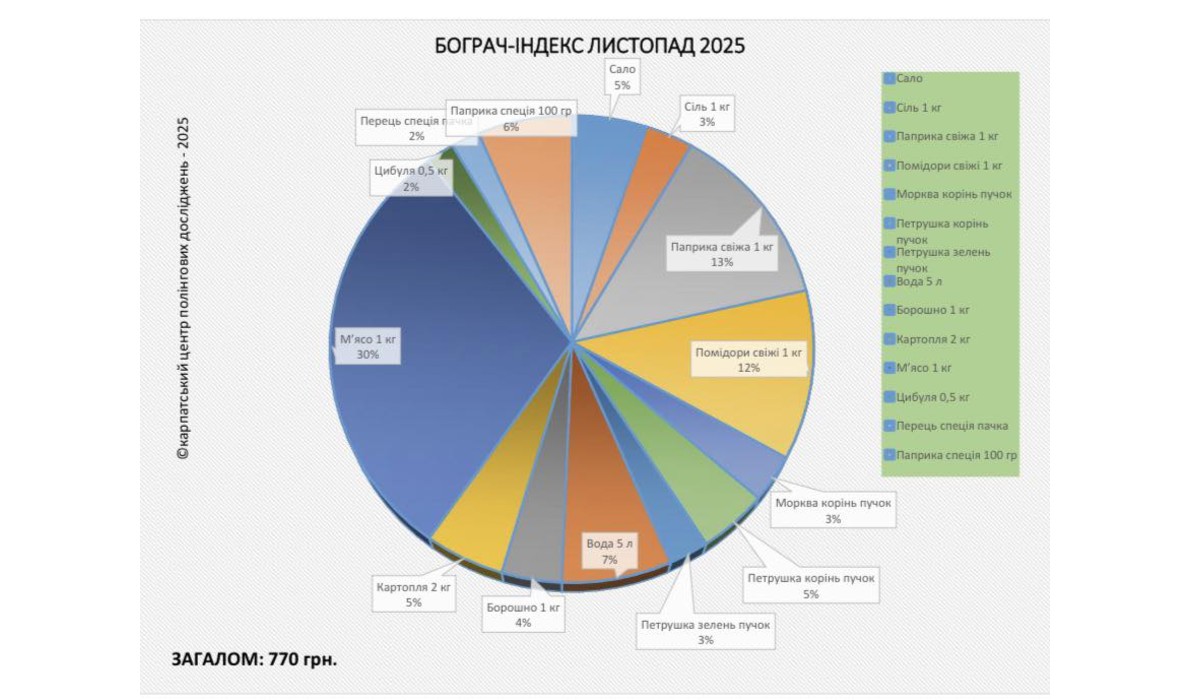 Míg októberben az azelőtt hónaphoz képest 6,2%-os árcsökkenést figyeltek meg a piacon, addig novemberre 12,5%-kal emelkedett az alapanyagok ára. Vagyis egy öttagú család számára a bográcsgulyás szeptemberben 670 hrivnyába, októberben 684 hrivnyába került, addig novemberben 770 hrivnyára emelkedett a hozzávalók összege. Októberhez képest 86 hrivnyával drágultak az élelmiszerek.