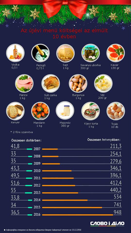 A következő három évben viszonylag stagnáltak az élelmiszerárak, azonban 2010-ben az ünnepi étrend elkészítésének költsége hirtelen 24 százalékkal, azaz 346 hrivnyára nőtt. További jelentős, 21 százalékos (200 hrivnyás) áremelkedés 2014-ben történt, majd 2015-ben 38 százalékos, 2016-ban 27 százalékos volt a drágulás. Míg tavaly átlagosan 741 hrivnyába került egy ünnepi vacsora két fő részére, idén már 948 hrivnya költséggel kell számolnunk.