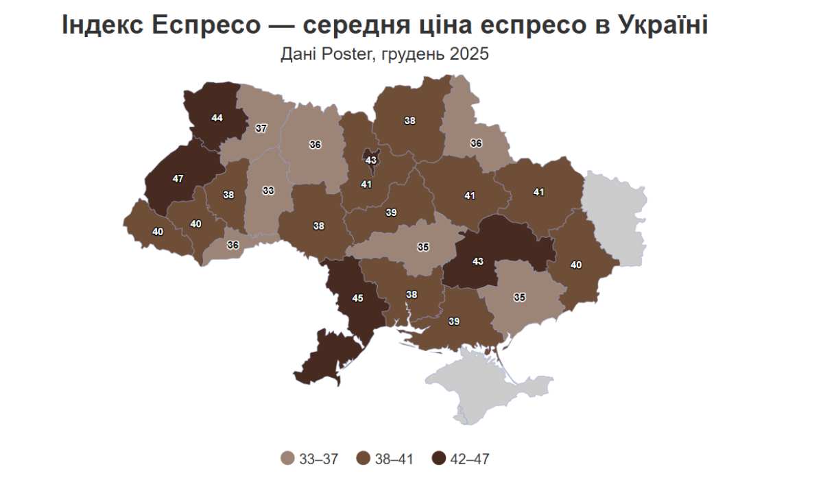 Nem minden régióban olyan magasak az árak, mint Lembergben. Hmelnyickij megyében immár harmadik éve a legalacsonyabb az eszpresszó ára: 33 hrivnya egy csésze, bár itt is 18%-kal nőtt az ár egy év alatt. Zaporizzsja és Kirovohrad megyében 35 hrivnyáért lehet kapni egy csésze eszpresszót.