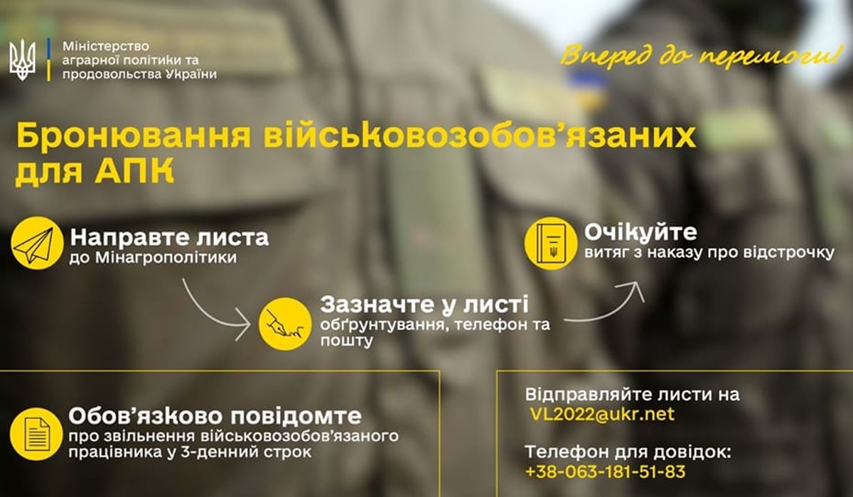 Az ukrán kormány engedményeket vezetett be a hadköteles állampolgárokkal szemben. A mezőgazdasági vállalkozásoknak és élelmiszer-kereskedőknek lehetőségük van benyújtani az Agrárpolitikai Minisztériumhoz azoknak a kritikus fontosságú munkát végző alkalmazottaknak a névsorát, akik a mozgósítás és a háború idején felmentést kapnak a katonai szolgálat alól.